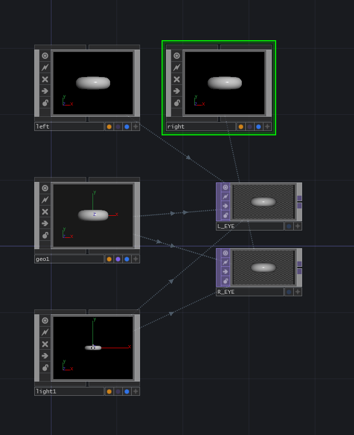 Let’s start by building a simple render network with a twist… we will have two cameras and two render TOPs. Set the “left eye camera” to the left render TOP and the “right eye camera” to the right render TOP. Below you will see an example with labels.